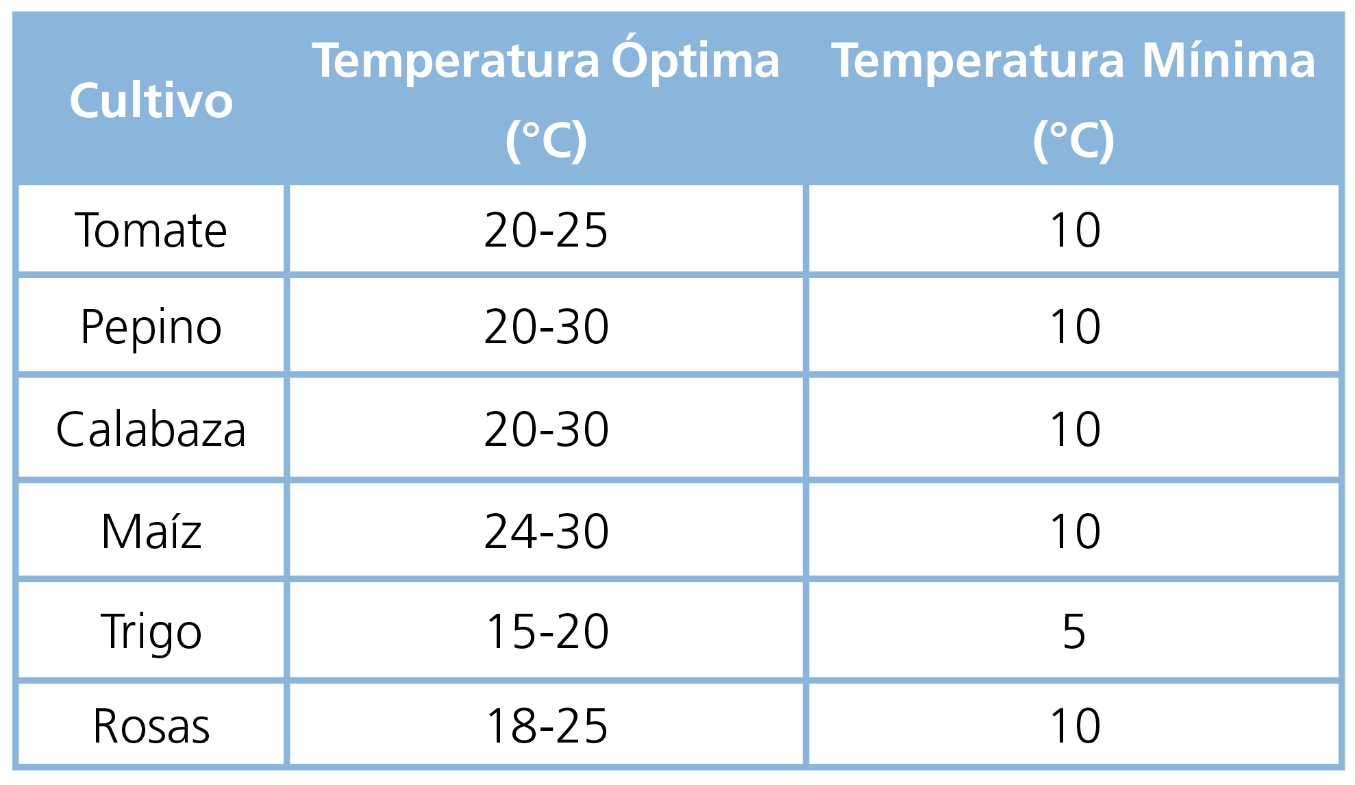 A continuación, se presenta una tabla con las temperaturas óptimas y mínimas para el desarrollo de algunos cultivos importantes, lo que permite identificar los rangos críticos donde las bajas temperaturas pueden afectar su crecimiento: