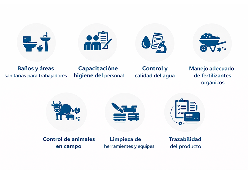 El agua utilizada en riego, lavado o contacto con el producto debe ser segura. Para ello, se exige monitoreo mediante análisis microbiológicos y registros documentados.