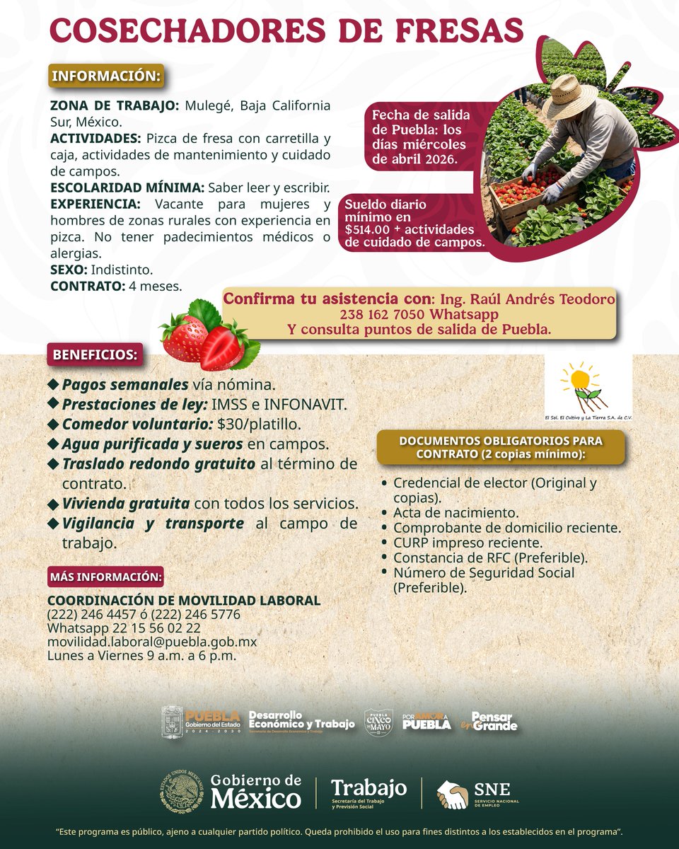 El Servicio Nacional del Empleo (SNE) en Puebla emitió una convocatoria dirigida a personas interesadas en trabajar como cosechadores de fresas en el municipio de Mulegé, en Baja California Sur. Se trata de una oferta laboral temporal de cuatro meses.