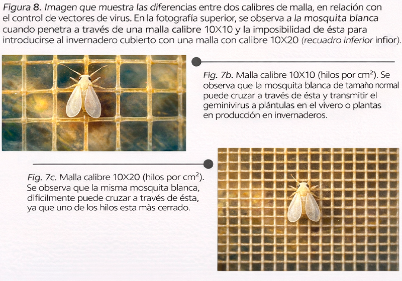Por otro lado, las mallas que se colocan en invernaderos tienen diferentes calibres, por lo que deberá de seleccionarse el que impide la entrada del vector, como son las de calibre 10X20 ó 20X20, para mosquita blanca, pulgones o paratrioza.