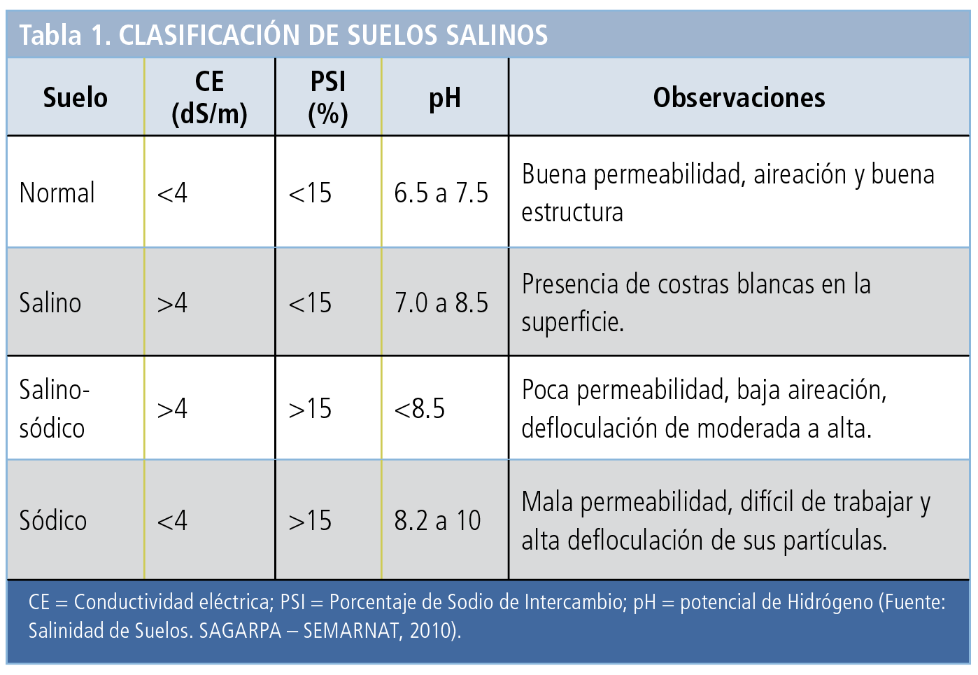 La principal fuente de acumulación de Sodio en suelos es por el uso de agua de pozos profundos con alto contenido de sales o bien mediante la brisa marina en las planicies costeras. Los parámetros para determinar la concentración de Sodio se pueden obtener a través de un estudio de suelo en laboratorio. La Tabla 1 nos da una referencia para detectar problemas de salinidad y sodicidad de sus suelos.